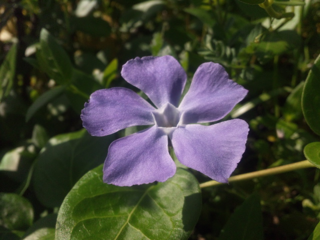 線路沿いに咲く紫色の蔓日々草(ツルニチニチソウ)