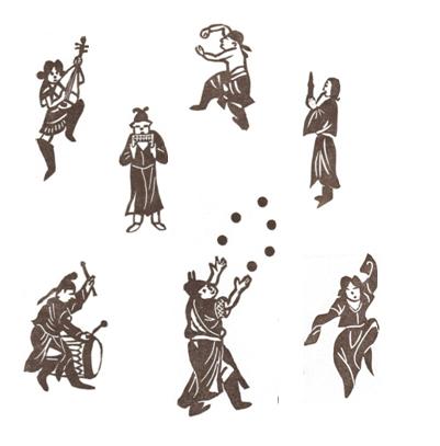 墨絵弾弓の中で曲芸師やダンサーたちは