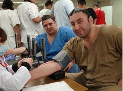 先日、行われた健康診断で仲良しの碧山と血圧を測っています