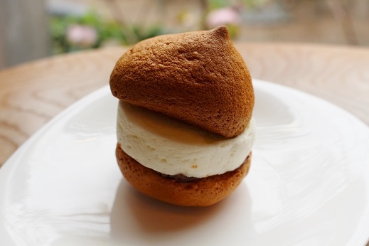 とんがり帽子のようなカステラの間にクリームと小豆がサンドしてあります