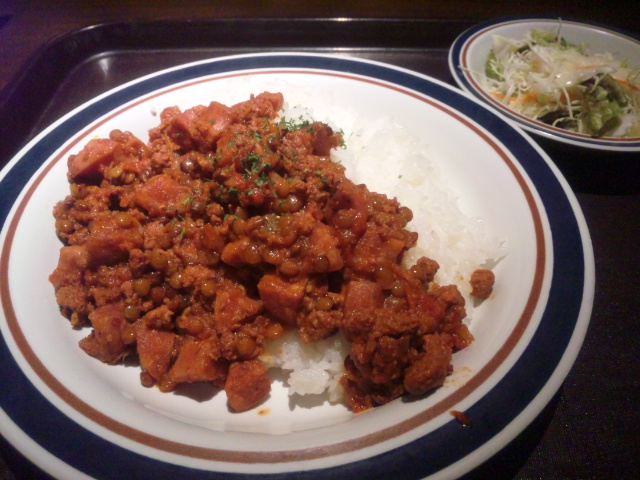 ひき肉とお豆の煮込み「チリコンカン」がご飯の上にかかっています