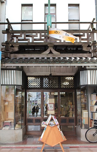 屋根の上にある卍崩しのような欄干が仏教書専門店らしさを醸し出しています