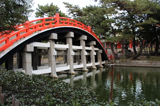 一の鳥居をくぐると赤い太鼓橋が見えます