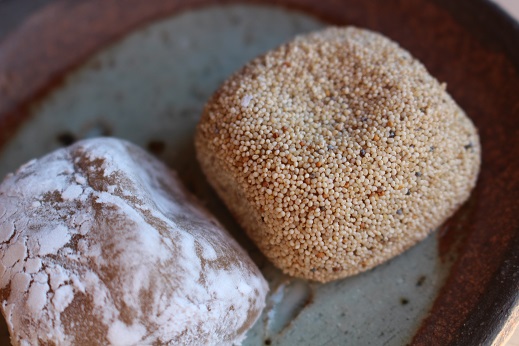 小豆のこし餡を餅皮で包んだものにけしの実をまぶしたもの