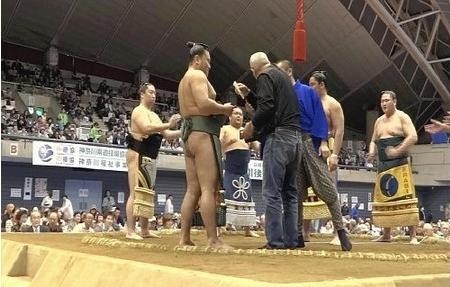 突然、おじさんが土俵に上がってきて