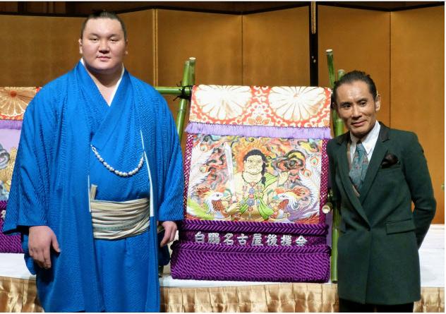昨日、名古屋白鵬後援会が横綱土俵入りの化粧まわしを贈呈しました