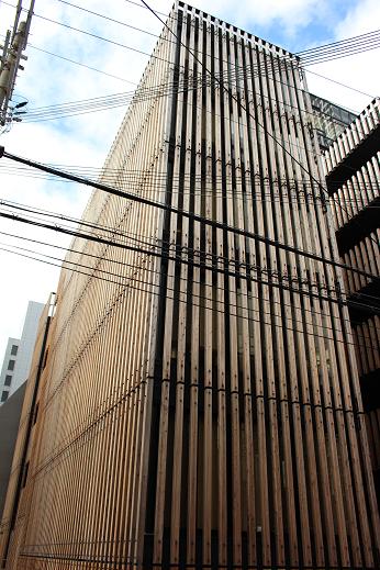 木製ルーバーに囲まれたビルはJST大阪ビルディング