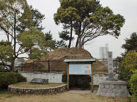 住宅地に忽然と現れる土塁は緒川城址、水野貞守が築いた城です