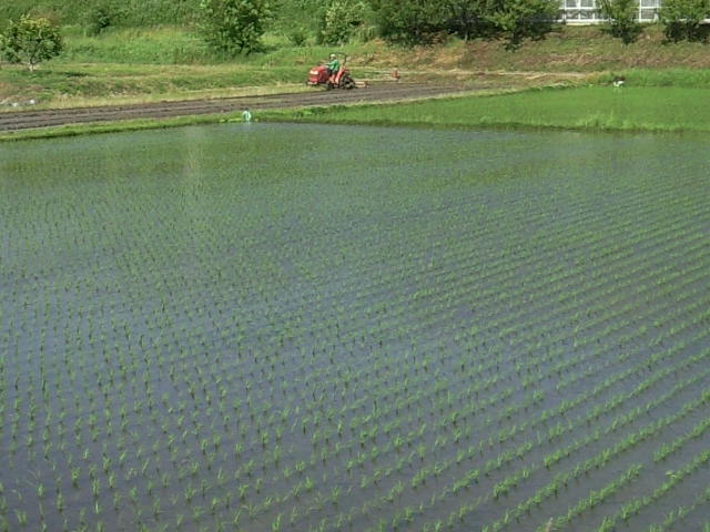 わが町阿久比の田んぼは、ほぼ田植えが終わりました、と思いきや、ご近所の田んぼ、まだ残っていたようです。梅雨入り前の先週末、おにいさんが最後の田植えに精を出していました。