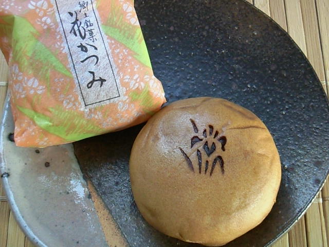 花より団子ではありませんが、その帰り道、近くの和菓子屋「美奈川製菓」に寄って、その名も「花かつみ」という焼きまんじゅうを買いました。その焼きまんじゅうにも花かつみが咲いていました。